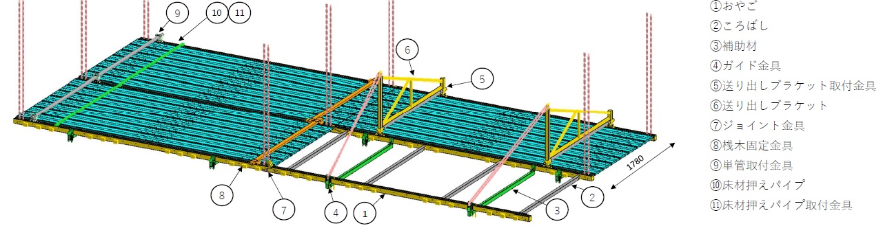 - 手の届かない位置まで、「おやご」を安全に送り出すことができる治具(送り出しブラケット)があるため、床先行での施工が可能です。全ての作業がステージ上で完結します。